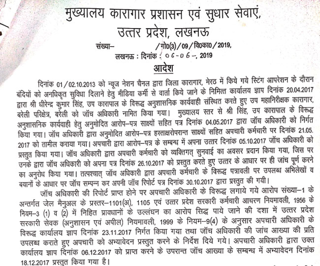 इसके अलावा मेरठ जेल में एक अक्टूबर 2013 को एक न्यूज चैनल द्वारा किये गये स्टिंग ऑपरेशन में बंदियों को अनाधिकृत सुविधा दिलाने की बात कर रहे डिप्टी जेलर धीरेंद्र कुमार सिंह के खिलाफ 20 अप्रैल 2017 को अनुशासनिक कार्रवाई करते हुए जांच उप महानिरीक्षक, कारागार बरेली को सौंपी गई थी। जांच में डिप्टी जेलर का आचरण भ्रष्टाचार से जुड़ा पाया गया। प्रमुख सचिव गृह ने जेलर व डिप्टी जेलर को सेवा से बर्खास्त किये जाने का शासनादेश जारी कर दिया है।