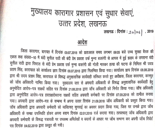 प्रमुख सचिव गृह अरविंद कुमार ने बताया कि जांच में दोनों अधिकारी ड्यूटी में लापरवाही के दोषी पाये गये और कोई संतोषजनक उत्तर नहीं दे सके। दोनों अधिकारियों के कृत्यों से शासन व कारागार विभाग की छवि को गहरा आघात पहुंचा था, जिसके चलते यह कठोर कदम उठाया गया।