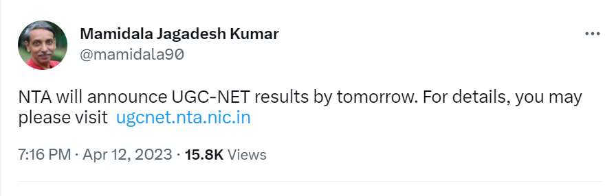 लखनऊ, जेएनएन: यूजीसी नेट दिसंबर रिजल्ट 2022 परीक्षा परिणाम की राह देख रहे अभ्यर्थियों के लिए काम की खबर है। विश्वविद्यालय अनुदान आयोग की राष्ट्रीय पात्रता परीक्षा (UGC NET) दिसंबर 2022 की परीक्षा के परिणाम कल यानी 13 अप्रैल को घोषित किए जाएंगे। इस संबंध में यूजीसी चेयरमैन एम. जगदीश कुमार ने ट्वीट कर जानकरी दी है।