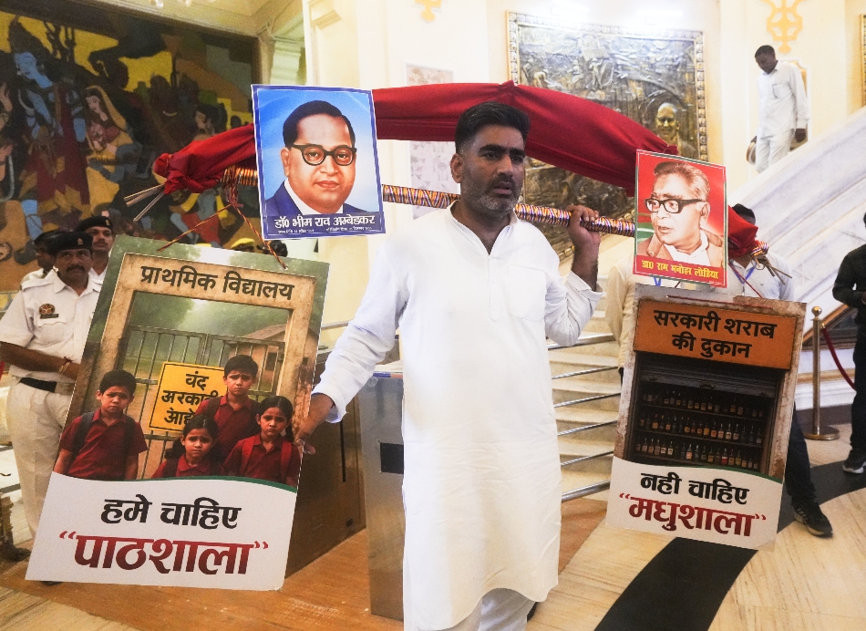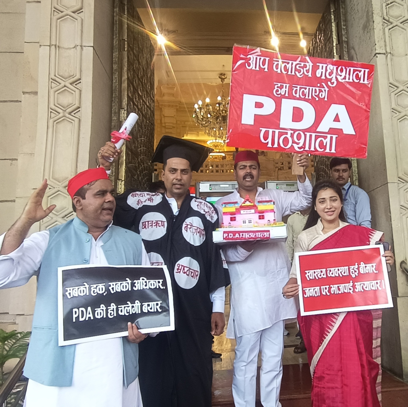 लखनऊ में मानसून सत्र के पहले दिन सपा विधायकों ने अनोखे तरीके से सरकार की नीतियों का विरोध किया। मेरठ के सपा विधायक अतुल प्रधान कांवड़ लेकर विधान भवन पहुंचे जिस पर पाठशाला और मधुशाला के संदेश थे। एमएलसी आशुतोष सिन्हा पीडीए पाठशाला का मॉडल लेकर आए जबकि अन्य विधायकों ने महंगाई और बेरोजगारी के खिलाफ प्रदर्शन किया। सरकार द्वारा पाठशालाएं बंद करने का भी विरोध किया गया।