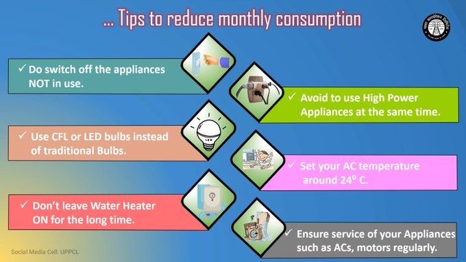 UPPCL की सोशल हैंडल पर बिजली की खपत को कम करने के लिए महत्वपूर्ण जानकारियां बताई गई हैं। यूपी बिजली विभाग के अनुसार, अगर इन टिप्स को फॉलो किया जाए तो हर महीने बिजली की खपत में काफी कमी आएगी और साथ ही बिजली बिल भी हल्का हो जाएगा।
