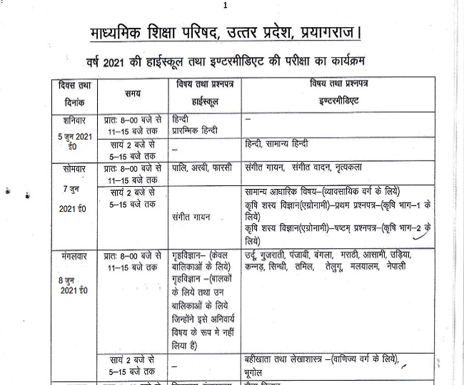 कोरोना वायरस संक्रमण के कारण प्रदेश सरकार ने सीबीएसई और आइसीएससी की तर्ज पर उत्तर प्रदेश माध्यमिक शिक्षा परिषद यानी यूपी बोर्ड की हाईस्कूल परीक्षा 2021 को स्थगित कर दिया है। इसके बाद बोर्ड कोविड संक्रमण की स्थिति में कुछ सुधार होने के बाद जुलाई के पहले हफ्ते तक इंटर की परीक्षा कराने की योजना बना रही है।