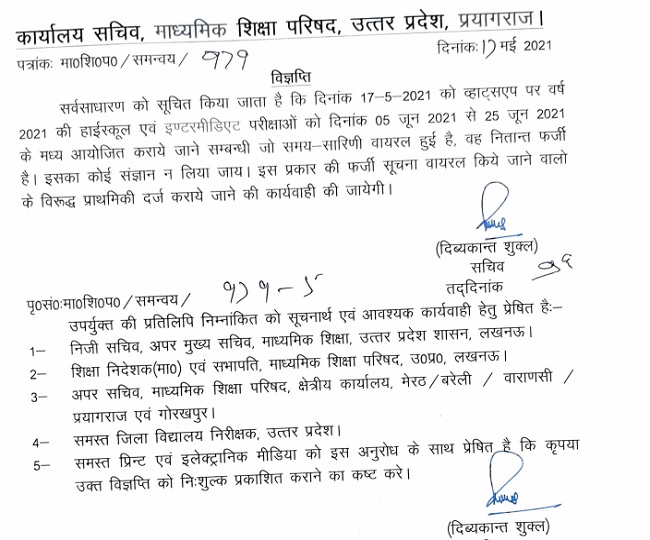 शराराती तत्व इंटरनेट मीडिया पर उत्तर प्रदेश माध्यमिक शिक्षा परिषद की इंटर तथा हाईस्कूल परीक्षा 2021 का फर्जी कार्यक्रम वायरल कर दिया है। पांच जून से परीक्षा कार्यक्रम को देखकर प्रदेश के लाखों छात्र-छात्राओं के होश उड़ गए। ऐसे में उत्तर प्रदेश माध्यमिक शिक्षा परिषद के सचिव ने मोर्चा संभाला।
