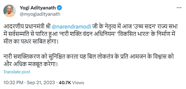 सीएम योगी आदित्यनाथ ने यह बात ट्वीट के माध्यम से कही। उन्होंने लिखा, “आदरणीय प्रधानमंत्री श्री @narendramodi जी के नेतृत्व में आज 'उच्च सदन' राज्यसभा में सर्वसम्मति से पारित हुआ 'नारी शक्ति वंदन अधिनियम’ 'विकसित भारत' के निर्माण में मील का पत्थर साबित होगा। नारी सशक्तिकरण को सुनिश्चित करता यह बिल लोकतंत्र के प्रति आमजन के विश्वास को और अधिक मजबूत करेगा”।