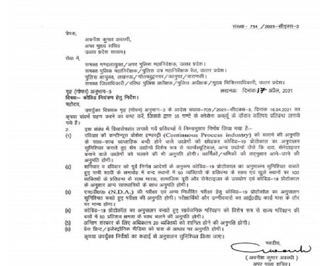 मुख्यमंत्री योगी आदित्यनाथ का निर्देश है कि उत्तर प्रदेश में शनिवार रविवार को सभी औद्योगिक इकाइया चालू रहेंगी। इस दौरान वहां के प्रबंधन को कर्मियों की देखरेख करनी होगी। इसके साथ ही शनिवार व रविवार को शादियां बंद स्थानों के अंदर 50 व्यक्तियों के प्रतिबंध और खुले स्थानों पर 100 व्यक्तियों के साथ हो सकेंगी। प्रदेश में कई केंद्र पर होने वाली सभी परीक्षाओं जैसे एनडीए आदि के अभ्यर्थी एडमिट कार्ड दिखा जा कसेंगे। इसके साथ ही रोडवेज बसों को भी 50 प्रतिशत की क्षमता के साथ चलाया जाएगा। जिससे फैक्ट्रियों में जाने वालों के साथ ही परीक्षार्थियों को किसी भी प्रकार की कठिनाई का सामना न करना पड़े।
