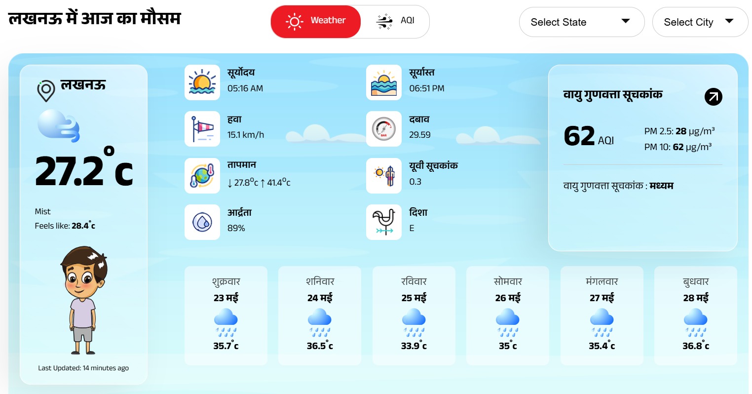 गुरुवार को बहराइच, गोरखपुर, महाराजगंज, कुशीनगर, लखीमपुर जैसे तराई इलाकों में गरज-चमक के साथ बूंदाबांदी हुई। मौसम विभाग के मुताबिक, राजधानी सहित पूर्वी और पश्चिम के सभी जिलों में शुक्रवार से हल्की से मध्यम वर्षा शुरू होगी। बादल छाने और गरज-चमक के साथ हल्की से मध्यम बारिश का सिलसिला 27 मई तक जारी रहने के पूर्वानुमान हैं।