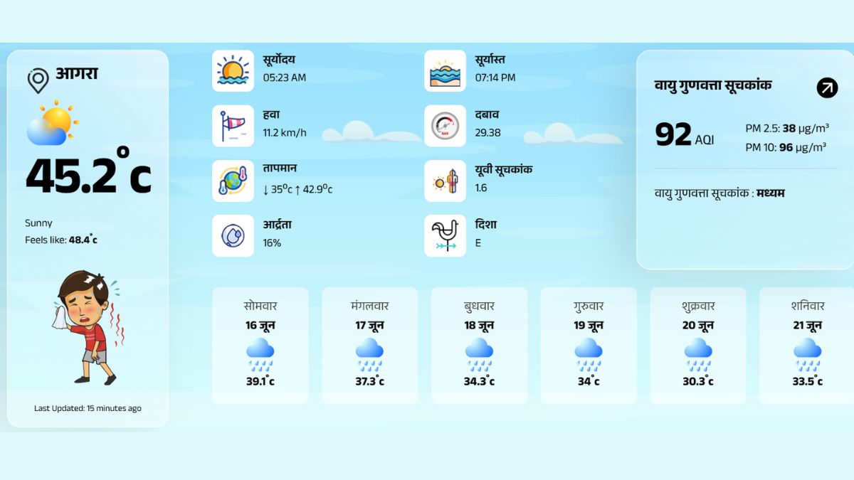 आगरा: भीषण गर्मी और लू से बेहाल लोगों को सोमवार सुबह हुई प्री मानसून की बारिश से राहत मिल गई। सुबह दो घंटे बादलों की गरज चमक के साथ तेज बारिश हुई। इसके साथ ही 40 किलोमीटर प्रति घंटा की गति से हवा चलती रही। इसके बाद तेज धूप निकल आई, दिन में उमस से लोग परेशान रहे। रात के तापमान में भी गिरावट दर्ज की गई है। मौसम विभाग का पूर्वानुमान है कि अब लगातार बारिश होगी।
