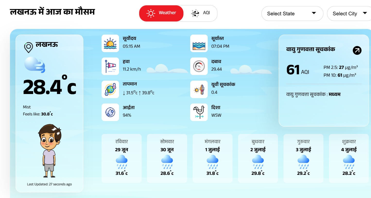 जुलाई पहले सप्ताह में मानसून मजबूत रहेगा, जिससे पूरे प्रदेश में अच्छी बारिश के संकेत मिल रहे है। इसके अलावा कई जिलों में वज्रपात का भी अलर्ट है। लखनऊ में रविवार को दिन का तापामान 34 डिग्री सेल्सियस रहने का अनुमान है।
