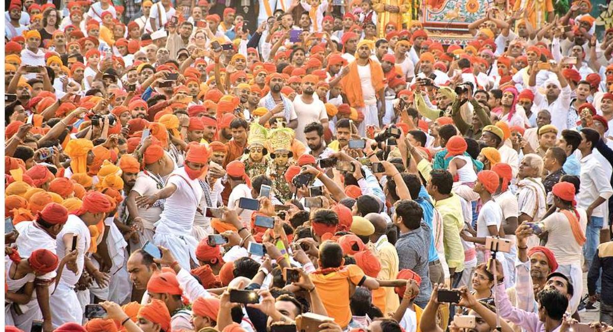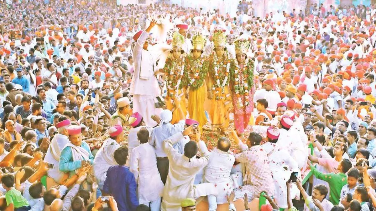 पुलिस ने मुख्य गेट पर बैरियर लगाकर भीड़ को रोक रखा था। जब भगवान राम का छह टन वजनी विमान उठाए यादव बंधु वहां पहुंचे और उनके लिए बैरियर खोला गया तो उसके साथ ही बाहर जमा भीड़ भी अंदर घुसने लगी।
