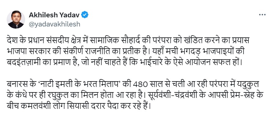 पूर्व मुख्यमंत्री ने आगे कहा- बनारस के ‘नाटी इमली के भरत मिलाप’ की 480 साल से चली आ रही परंपरा में यदुकुल के कंधे पर ही रघुकुल का मिलन होता आ रहा है। सूर्यवंशी-चंद्रवंशी के आपसी प्रेम-स्नेह के बीच कमलवंशी लोग सियासी दरार पैदा कर रहे हैं।