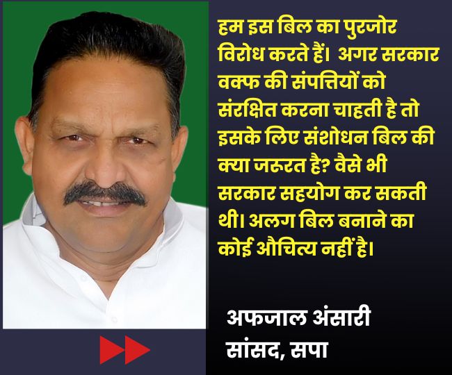 सपा के सांसद अफजाल अंसारी ने संसद में वक्फ संशोधन बिल पर चर्चा करते हुए कहा कि वह इस बिल का पुरजोर विरोध करते हैं। सवाल उठाया कि अगर सरकार वक्फ की संपत्तियों को संरक्षित करना चाहती है तो इसके लिए संशोधन बिल की क्या जरूरत है? वैसे भी सरकार सहयोग कर सकती थी।