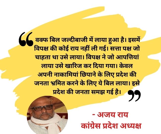 इसके अलावा कांग्रेस प्रदेश अध्यक्ष अजय राय ने प्रतिक्रिया देते हुए कहा कि वक्फ बिल जल्दीबाजी में लाया हुआ है। इसमें विपक्ष की कोई राय नहीं ली गई।