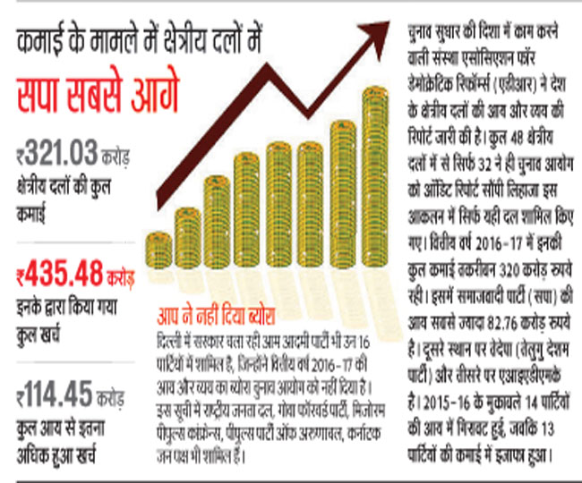 एसोसिएशन फॉर डेमोक्रेटिक रिफॉर्मस (एडीआर) ने मंगलवार को देश के क्षेत्रीय दलों के वर्ष 2016-17 के आय-व्यय की रिपोर्ट पेश की। इसमें 32 दलों की कुल आय 321.03 करोड़ रुपये है। सपा के बाद दूसरा नंबर तेलुगु देशम पार्टी (टीडीपी) का है। इसकी आय 72.92 करोड़ रुपये है। वहीं, तीसरा नंबर एआइएडीएमके का है। इसने अपनी आय 48.88 करोड़ रुपये दिखाई है।