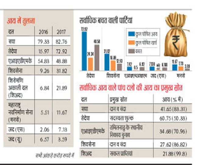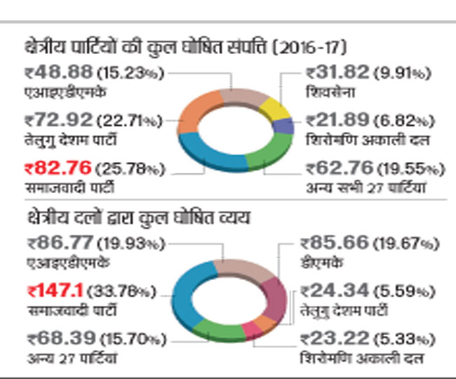 वहीं, टीडीपी ने कहा कि उसकी आय का 67 फीसद शेष है। डीएमके ने अपनी आय से 81.88 करोड़ रुपये ज्यादा खर्च होने की घोषणा की है। एआइएडीएमके ने भी आय से 37.89 करोड़ रुपये ज्यादा खर्च होने की जानकारी दी है। रिपोर्ट में 32 क्षेत्रीय पार्टियों के अलावा 16 क्षेत्रीय पार्टियों ने अपना लेखा-जोखा चुनाव आयोग को उपलब्ध नहीं कराया है। इसमें आम आदमी पार्टी, नेशनल कांफ्रेंस व राष्ट्रीय जनता दल शामिल हैं।