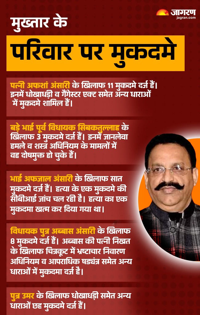 - पत्नी अफशां : मुख्तार की पत्नी अफशां अंसारी के विरुद्ध 11 मुकदमे दर्ज हैं। इनमें धोखाधड़ी व गैंगेस्टर एक्ट समेत अन्य धाराओं में मुकदमे शामिल हैं। तीन मामले कोर्ट में विचाराधीन हैं। शेष में पुलिस कोर्ट में आरोपपत्र दाखिल कर चुकी है।