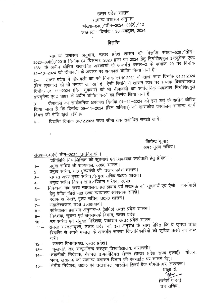 यूपी में दीपावाली की दो दिन की छुट्टी, 31 अक्टूबर और एक नवंबर को अवकाश लेकिन शर्तों के साथ