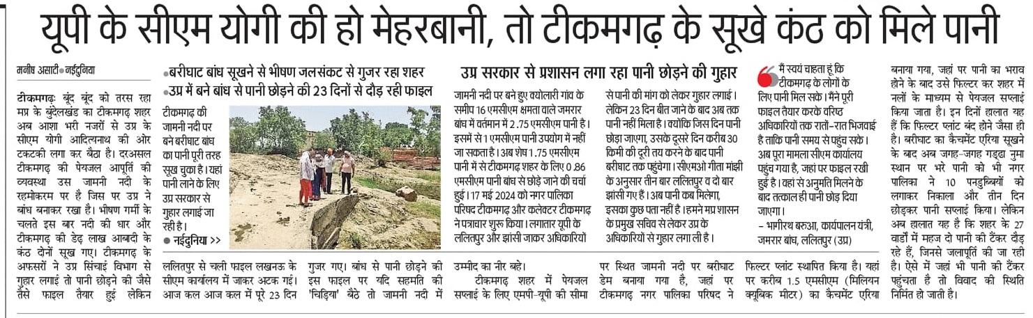 बता दें कि नईदुनिया ने इस मामले को लेकर लगातार समाचार प्रकाशित किए और प्रमुखता से टीकमगढ़ में पेयजल संकट के मामले को उठाया गया। शहर में पेयजल सप्लाई के लिए जामनी नदी में बरीघाट पर फिल्टर प्लांट स्थापित किया गया है, जहां जलस्तर घटने के बाद शहर में पेयजल सप्लाई के लिए पानी नहीं था। ऐसी स्थिति में 17 मई से नगर पालिका परिषद टीकमगढ़ के माध्यम से पत्राचार शुरू हुआ और उत्तर प्रदेश के ललितपुर जिले में स्थित जमरार बांध से पानी नदी में छोड़े जाने की मांग तेज हुई।