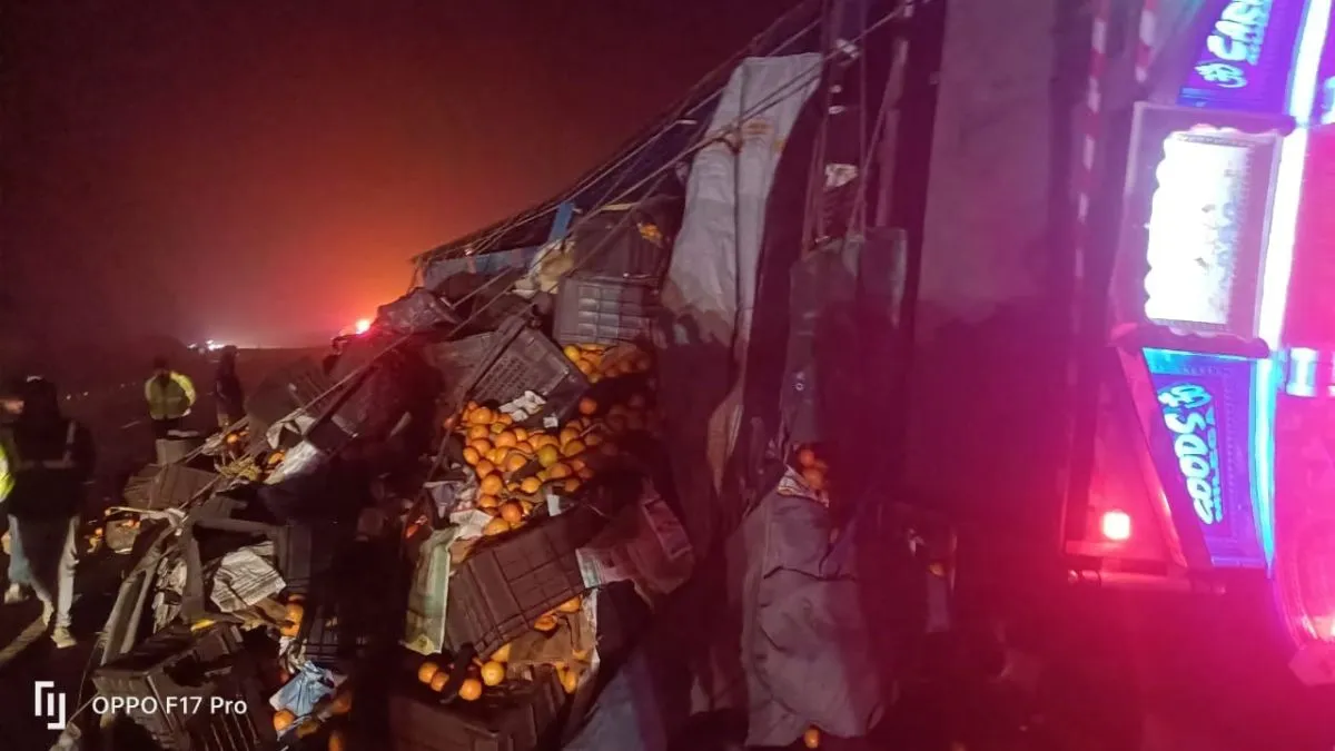 आगरा लखनऊ एक्सप्रेसवे पर पलटा ट्रक, चालक-क्लीनर घायल; किन्नू लूट ले गए गांव के लोग