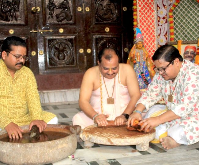 वृंदावन के ठाकुर राधादामोदर मंदिर में अक्षय तृतीया की तैयारियों को लेकर चंदन घिसते सेवायत। - फोटो: जागरण।