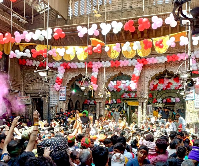 मथुरा- वृंदावन के ठाकुर बांकेबिहारी मंदिर में शनिवार को दर्शन करने पहुंचे श्रद्धालुओं की भीड़। - फोटो: जागरण।