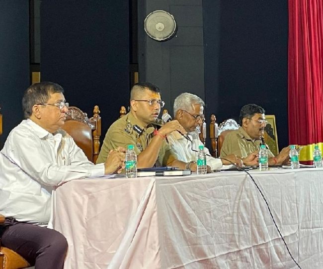 मथुरा- वृंदावन शोध संस्थान में पुलिसफाेर्स को ब्रीफिंग करते एसएसपी शैलेश कुमार पांडे साथ में डीएम शैलेंद्र कुमार सिंह। - फोटो: पुलिस द्वारा।