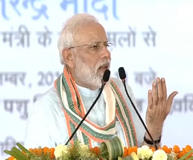 मथुरा, जेएनएन। प्रधानमंत्री नरेंद्र मोदी के मंच पर पहुंचते ही पंडाल मोदी-मोदी के नारों से गूंजा। पीएम मोदी ने हाथ हिलाकर और जोड़कर सभी का अभिवादन किया। सबसे पहले पीएम मोदी ने 'स्वच्छता ही सेवा' का शुभारंभ किया। इस बार यह अभियान प्लास्टिक के खिलाफ चलाया जा रहा है, जो 11 सितंबर से 2 अक्टूबर तक चलेगा।पीएम मोदी ने पशुपालन और दुग्ध उत्पादन के क्षेत्र में विभिन्न योजनाओं का भी शुभारंभ किया। उन्होंने श्रीकृष्ण की धरती से पशुओं को रोग मुक्त बनाने का संकल्प दिलाया। इस दौरान उन्होंने गाय और ओम के माध्यम से विपक्ष पर भी निशाना भी साधा।