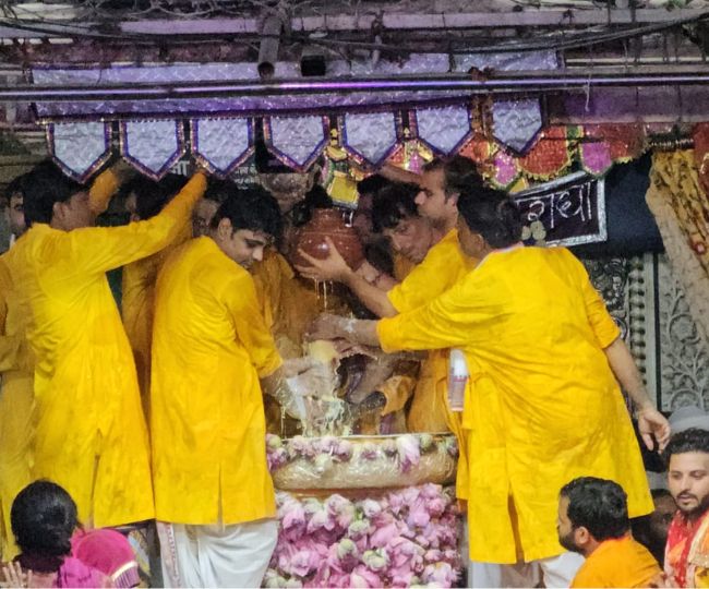मंदिर के सेवायत परिवारों के आचार्य वेद मंत्रों का उच्चारण करने लगे। मूल नक्षत्र में जन्मी राधारानी का बुधवार सुबह चार बजे से लगातार एक घंटा अभिषेक किया गया। दूध, दही, शहद, गाय का घी, इत्र, बूरा, 27 पेड़ों की पत्तियां, 27 जगह की रज, 27 कुओं का जल, सप्त अनाज, सात मेवा, सात फल से बारी-बारी से वृषभानु नंदनी के विग्रह का अभिषेक किया। यमुना जी सहित सात नदियों के जल से भी स्नान कराया गया।