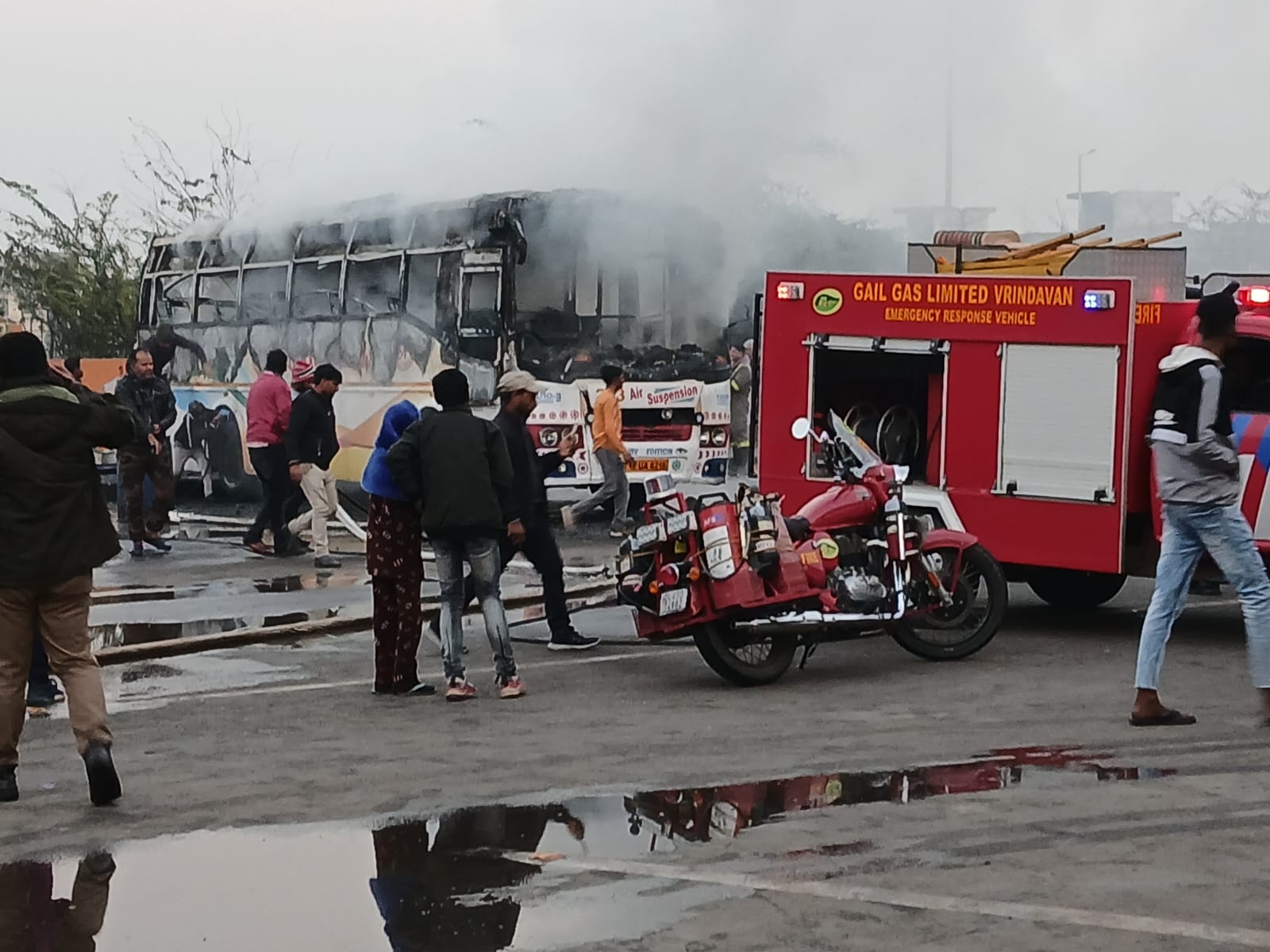 जिलाधिकारी शैलेंद्र कुमार सिंह ने बताया कि आशंका जताई जा रही है कि बस में बैठे रहे श्रद्धालु द्वारा बीड़ी पीने के दौरान आग लगी है। मामले की जांच कराई जा रही है। श्रद्धालुओं के खानेपीने, कपड़े की व्यवस्था की गई है। अपने घर तक पहुंचाने के लिए बस की व्यवस्था की जाएगी। मृतक के अंतिम संस्कार की व्यवस्था भी की जा रही है।