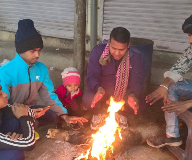 मथुरा में रविवार को ठंड से बचने के लिए अलाव का सहारा लेते लोग।