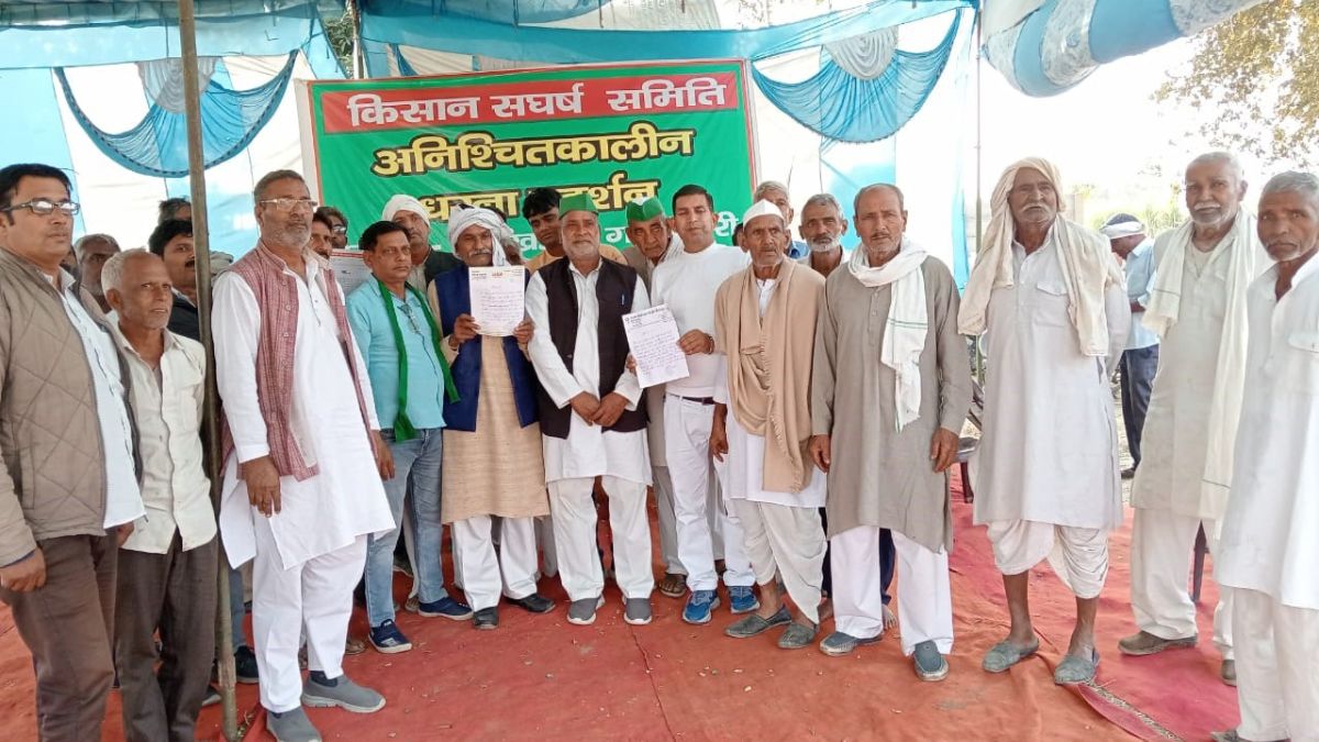 धरने में किसानों को सर्मथन पत्र देते हुए कैली के प्रधान पति बिजेन्द्र कुमार और कबटटा के प्रधान नरेश कुमार सौ संगठन
