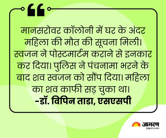 हीटर से निकली कार्बन मोनोऑक्साइड से महिला की मौत होना माना जा रहा है। कमरे से बदबू बाहर आने के बाद ही मौत की जानकारी हुई। तब नोएडा से पुत्रवधू दीप्ति शर्मा बच्चों के संग घर पहुंची। बिना पोस्टमार्टम कराए ही महिला का अंतिम संस्कार कर दिया।
