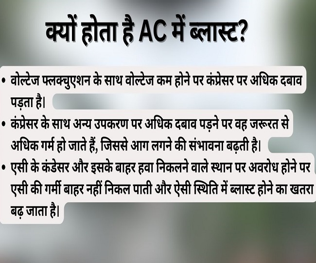 विशेषज्ञों के अनुसार ओवरलोडिंग, शार्ट सर्किट, खराब अथवा कमजोर वायरिंग, घटिया क्वालिटी के पार्ट्स का उपयोग धूल-गंदगी जमा होने से ओवरहीटिंग होती है। ऐसा अधिक गर्मी होने पर अधिक होता है। गलत इंस्टालेशन, रेफ्रिजरेंट का रिसाव, बिजली में वोल्टेज में उतार-चढ़ाव के साथ-साथ एसी का लंबे समय तक लगातार चलना भी आग लगने का हो सकता है।