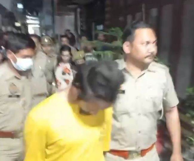 पत्नी को लेकर जाती पुलिस।
