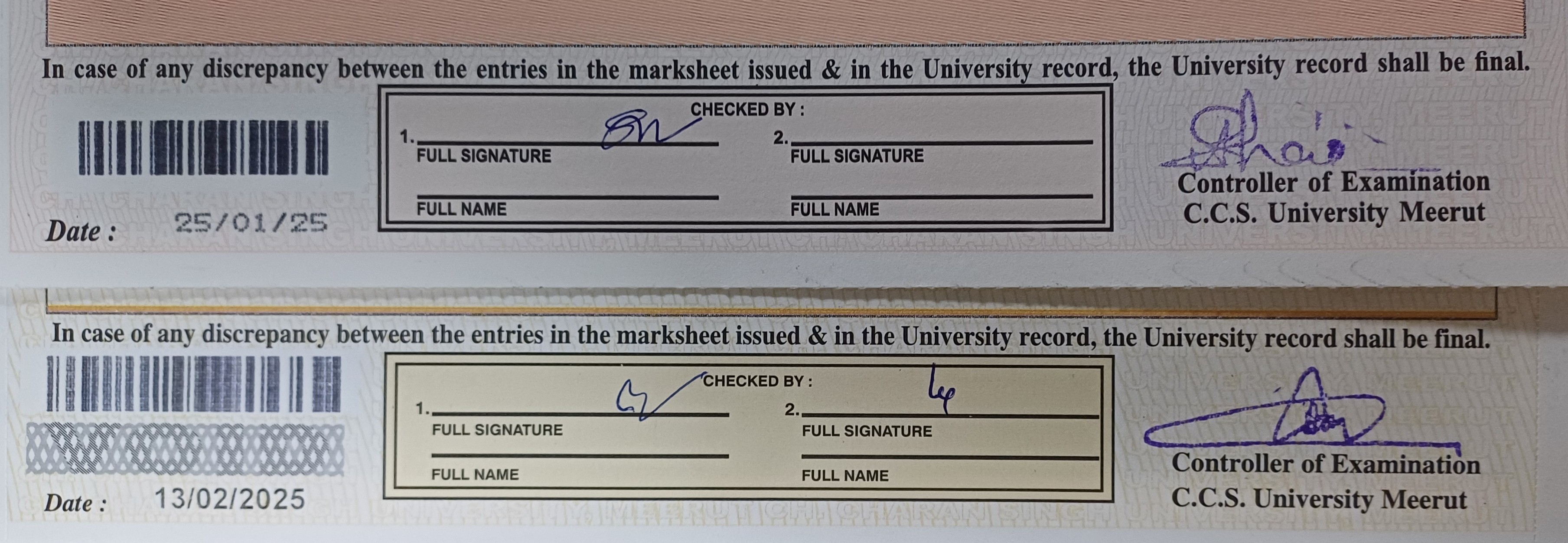 20 दिनों के अंतराल में सीसीएसयू की ओर से दो अलग तिथियों (बाएं) पर जारी दो मार्कशीट पर दो अलग-अलग परीक्षा नियंत्रकों के नाम की मुहर (दाएं)। जागरण