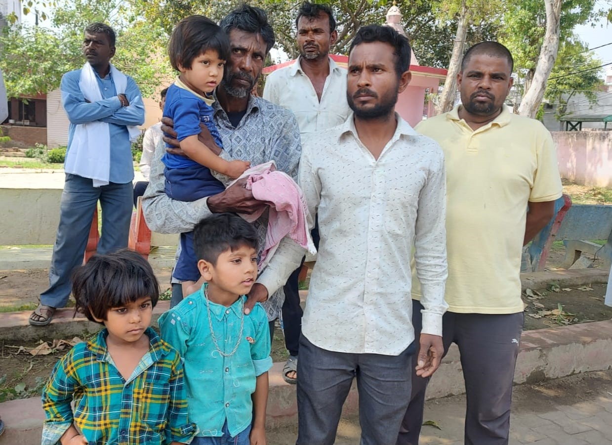 पति की हत्यारोपित रविता के तीन मासूम बच्चों को पकड़े हुए मृतका का ससुर व अन्य लोग। जागरण
