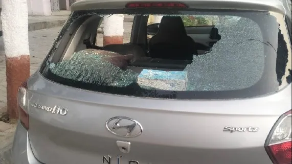 रामनगर में पथराव के बाद शीशे टूटी कार कंकरखेड़ा थाने में खड़ी। जागरण।