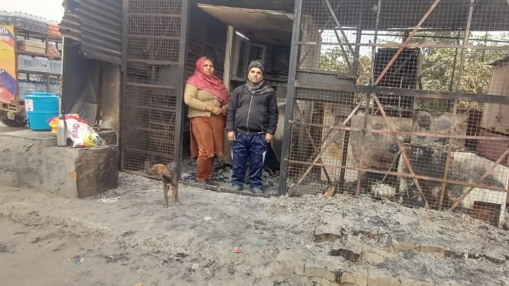खोखे में आग लगने के बाद मौके पर खड़ा राजीव कुमार अपनी पत्नी के साथ। जागरण