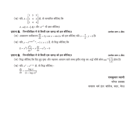 यह कहना है सनातन धर्म इंटर कालेज सदर वेस्ट एंड रोड के गणित प्रवक्ता रामकुमार त्यागी का। यूपी बोर्ड की 12 वीं गणित विषय की परीक्षा 29 फरवरी को है। गणित विषय की परीक्षा में अच्छे अंक लाने के लिए उनका कहना है कि रटी हुई चीजें परीक्षार्थी आसानी से भूल सकते हैं, लेकिन समझी हुई बात हमेशा अपने पास रहती है। इस तरीके से परीक्षार्थी कठिन कांसेप्ट को भी आसानी से समझ सकते हैं।
