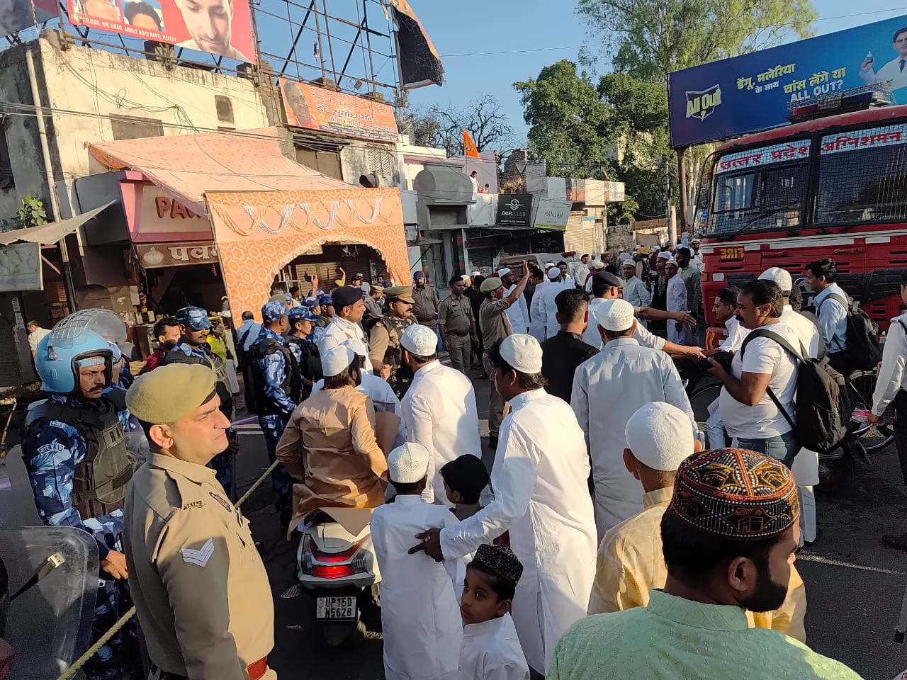 ईदगाह जाने वाले रास्ते पर पुलिस ने जगह-जगह बैरिकेडिंग की हुई थी। नमाज शुरू होने के पहले पुलिस ने ईदगाह की ओर आ रहे लोगों को रोक दिया जिस पर लोगों ने विरोध जाहिर किया। ईदगाह कमेटी की ओर से भी ऐलान किया गया कि अभी ईदगाह परिसर में काफी जगह खाली है इसलिए नमाजियों को अंदर आने दे। इसके बाद नमाजी नारे लगाते हुए ईदगाह की ओर बना हुए।