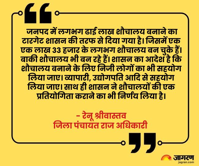 जिला पंचायत राज अधिकारी रेनू श्रीवास्तव ने बताया कि जनपद में लगभग ढाई लाख शौचालय बनाने का टारगेट शासन की तरफ से दिया गया है। जिसमें एक एक लाख 33 हजार के लगभग शौचालय बन चुके हैं। बाकी शौचालय भी बन रहे हैं। शासन का आदेश है कि शौचालय बनाने के लिए निजी लोगों का भी सहयोग लिया जाए। व्यापारी, उद्योगपति आदि से सहयोग लिया जाए। साथ ही शासन ने शौचालयों की एक प्रतियोगिता कराने का भी निर्णय लिया है।