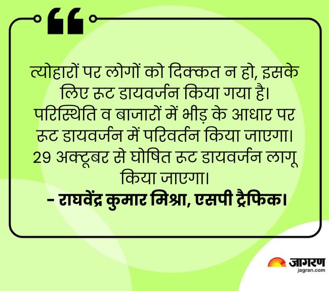 29 अक्टूबर यानि कल से यह व्यवस्था लागू कर दी जाएगी। तीन नवंबर तक रूट डायवर्जन जारी रहेगा। हालांकि यातायात पुलिस का दावा है कि बाजारों में भीड़भाड़ के आधार पर रूट डायवर्जन में छूट व बदलाव किया जा सकता है।