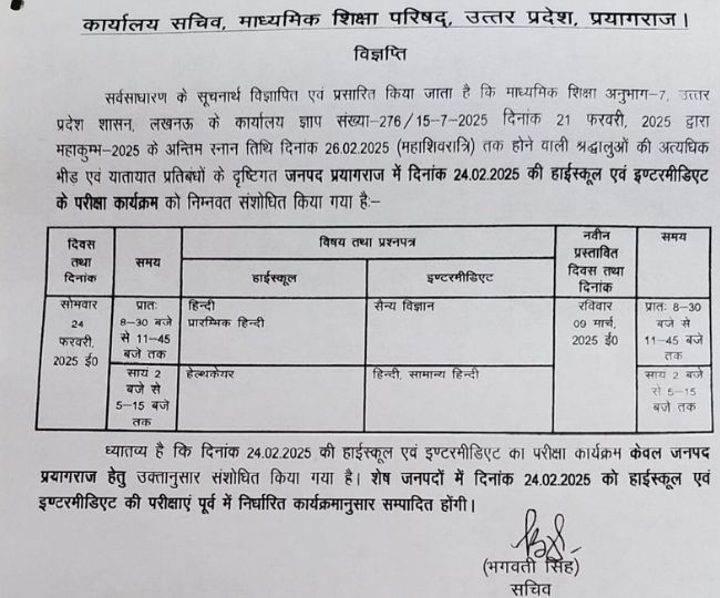 क्षेत्रीय बोर्ड कार्यालय मेरठ के उप सचिव प्रशासन रविंद्र पाल सिंह का कहना है, कि जनपद प्रयागराज में महाकुंभ के चलते 24 फरवरी को होने वाली परीक्षा के कार्यक्रम में संशोधित किया गया है। केवल प्रयागराज जनपद में 24 फरवरी को होने वाली परीक्षा अब आगामी 9 मार्च को होगी। 24 की परीक्षा का समय वही रहेगा। यानी 24 फरवरी को सुबह व शाम की पाली में होने वाली हाई स्कूल वह इंटरमीडिएट की परीक्षाएं 9 मार्च को पूर्व निर्धारित पाली के अनुसार ही होगी।