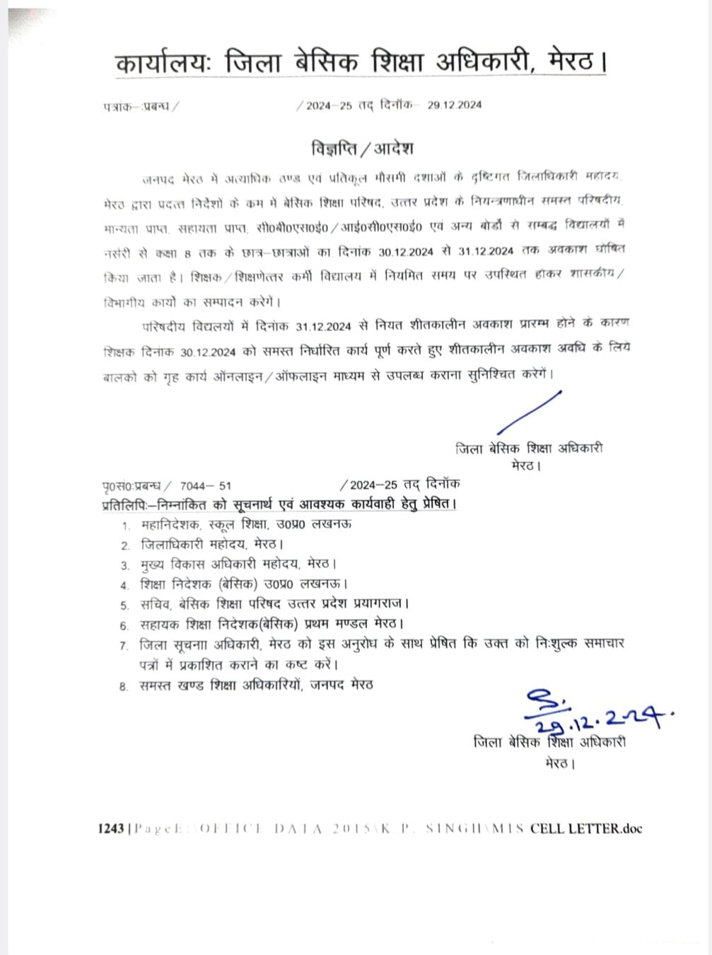 बीएसए ने कहा है कि परिषदीय विद्यालयों में 31 दिसंबर से निर्धारित शीतकालीन अवकाश शुरू होने के कारण शिक्षक 30 दिसंबर को सभी निर्धारित कार्य पूरा करेंगे। शीतकालीन अवकाश अवधि के लिए बालकों को गृह कार्य आनलाइन व आफलाइन माध्यम से उपलब्ध कराना सुनिश्चित करेंगे।