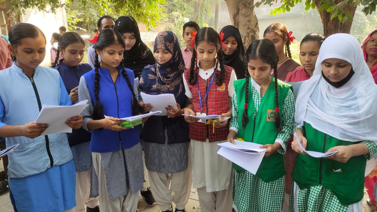 राजकीय इंटर कॉलेज परीक्षा केंद्र पर परीक्षा के बाद पेपर का मिलन करती छात्राएं।