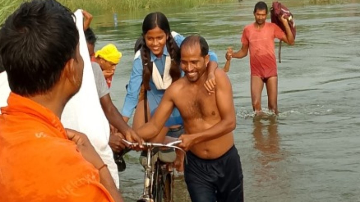 मीरजापुर में बाढ़ के पानी में कंधे पर बैठाकर बच्चों को स्कूल पहुंचा रहे अभिभावक
