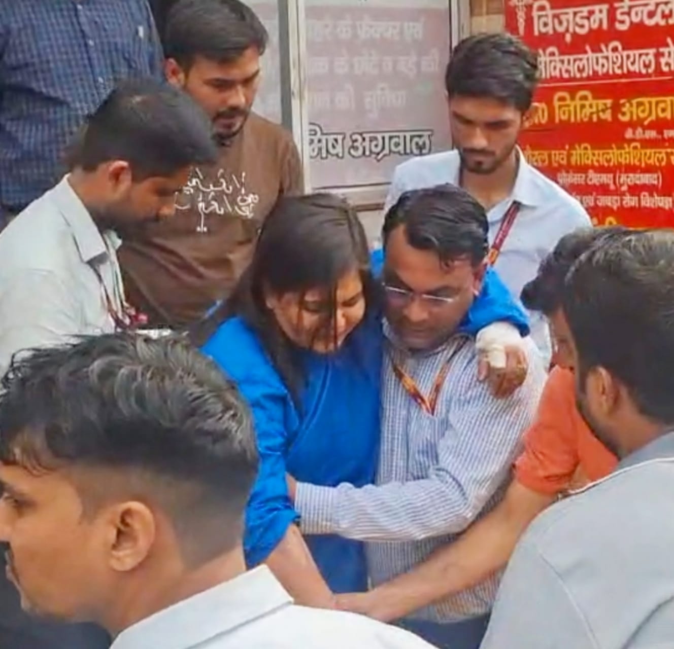 स्कूली बस की टक्कर से घायल बैंक क्लर्क श्रेया को उपचार के लिए अस्पताल ले जाते स्वजन व सहकर्मी।