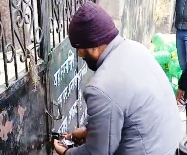 कंपनी बाग में मकान में ताला लगाते नगर निगम कर्मचारी।