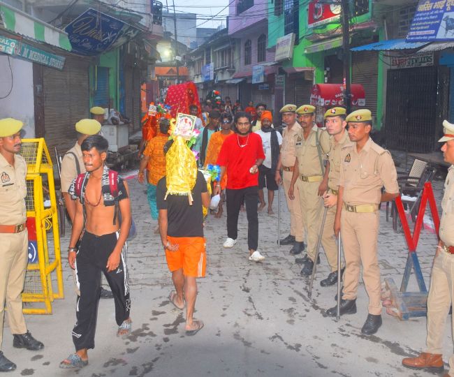 शिव मंदिर पर गंगाजल अभिषेक करने जाते कांवड़िया, पुलिस का सख्त पहरा।