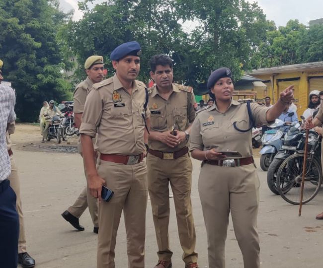 घटनास्थल पर पहुंचे पुलिस अधिकारी।