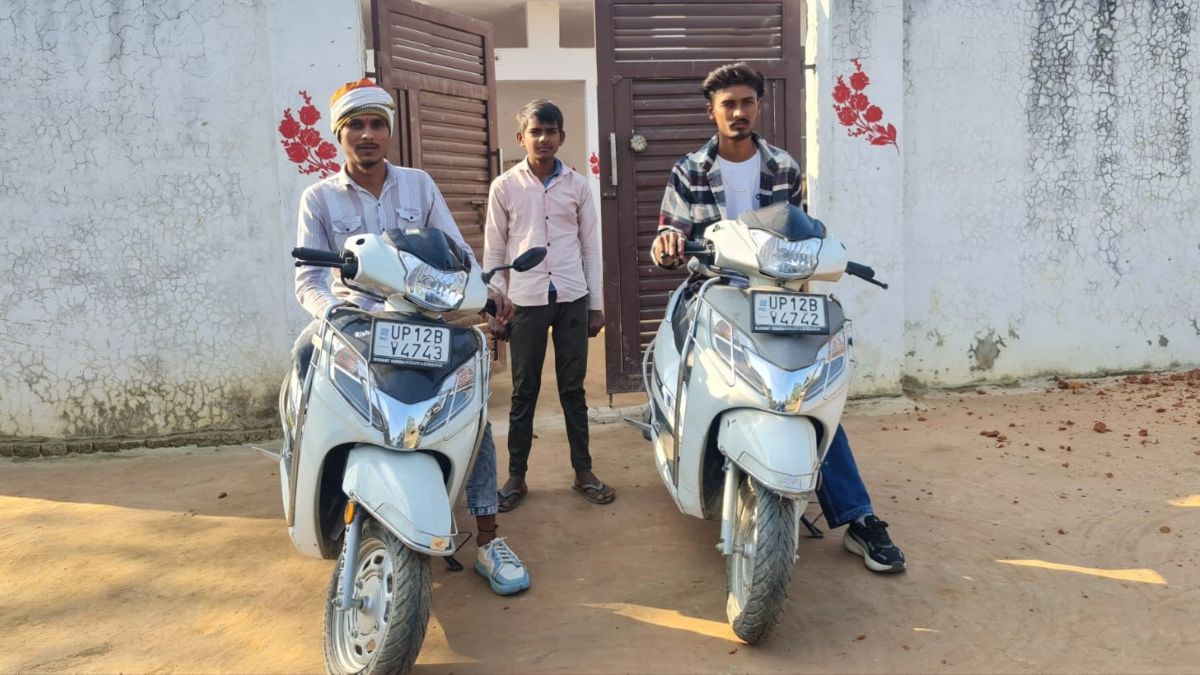 पुरकाजी के गांव बुच्चा बस्ती में ऋषभ पंत द्वारा भेजे गए स्कूटरों के साथ रजत और निशु । जागरण